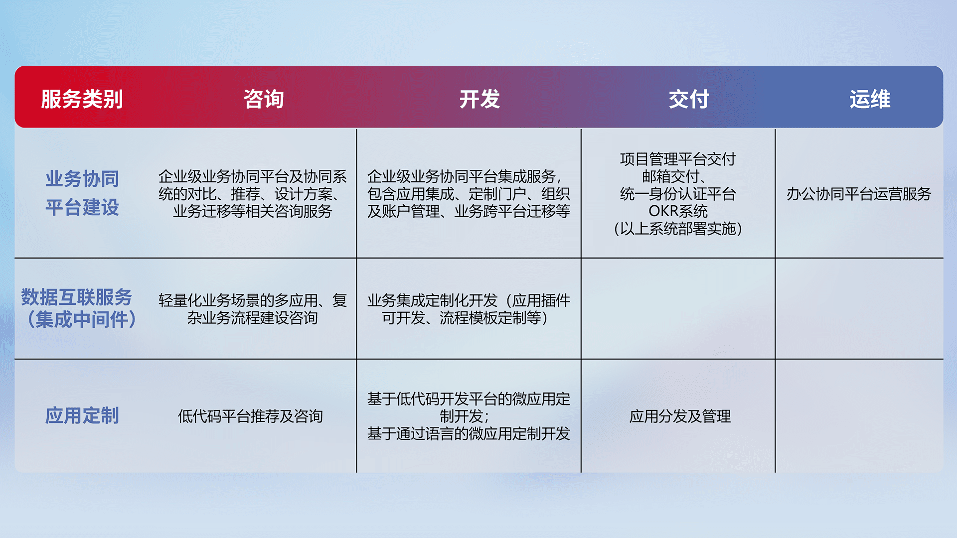 针对钉钉、、企微、、IDaas等平台级产品提供产品的规划、、方案、、、、交付、、、定制化开发等服务,,,,实现如统一协同办公、、智能客户服务、、、混合会议管理、、、智能数据查询、、等业务场景,,实现数字化转型。。