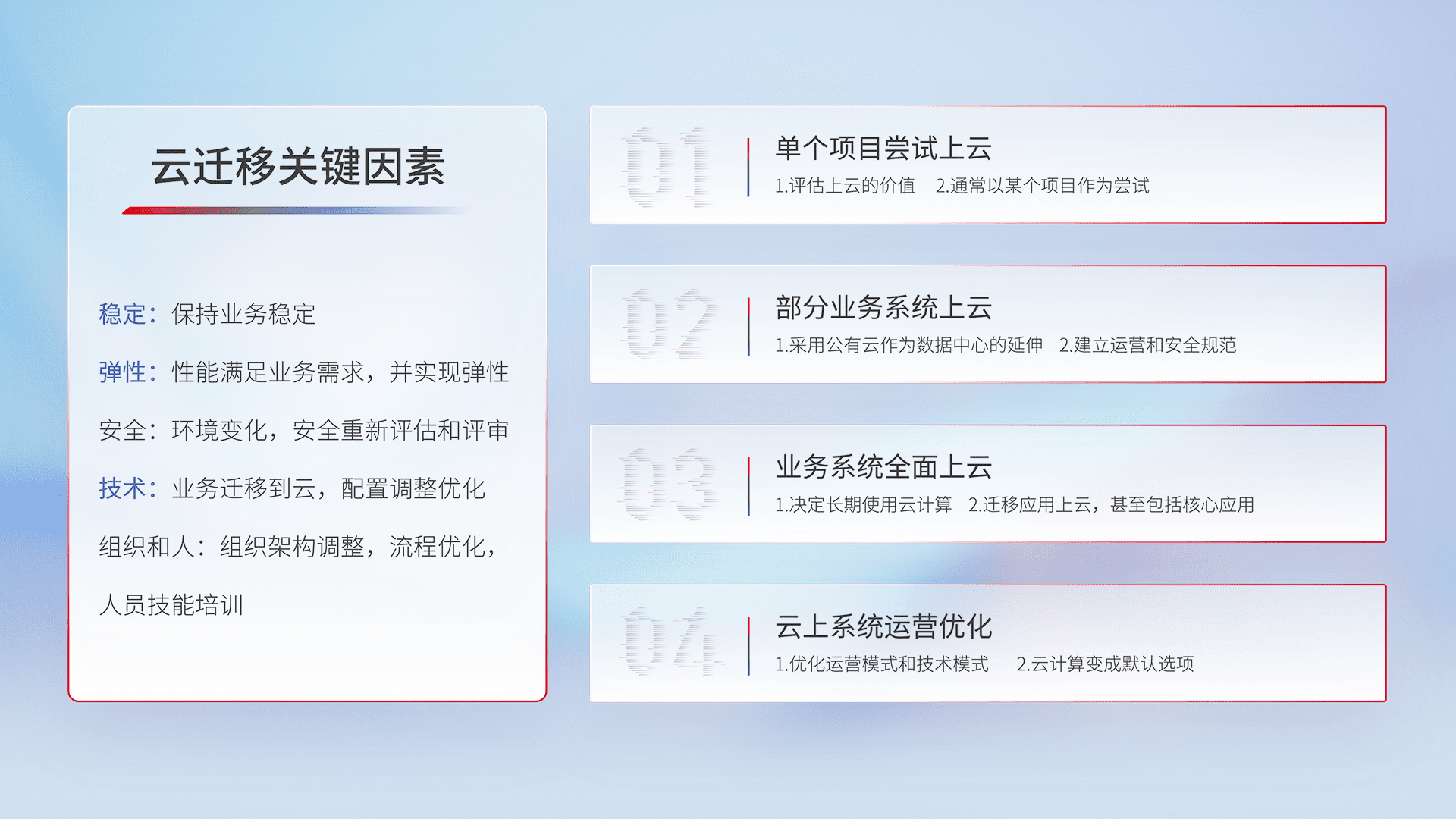 结合实际业务,,从规划设计、、、云平台选型、、云原生改造、、数据迁移、、、集成交付,,,,迁移全过程为客户识别最佳上云路径,,,做好风险识别管理,,,,设计网络架构、、、、身份权限、、、安全审计合规、、、操作审计、、、、日志审计、、、、监控告警策略、、多站点容灾设计等,,,对云上基础设施进行整体规划,,,提升IT治理水平,,,以满足弹性、、、高可用、、、高性能的需求。。。