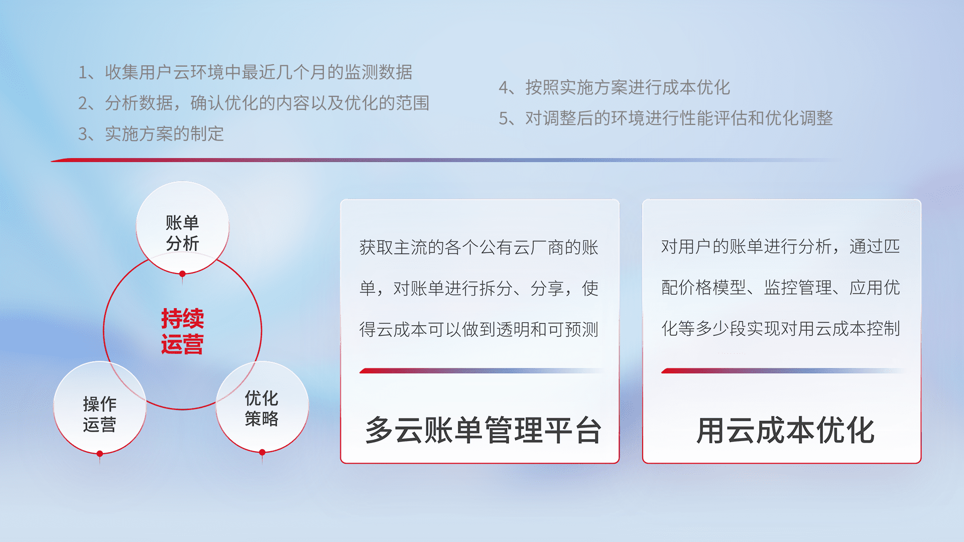 通过灵活运用多种自动化迁移工具,,,,帮助企业用户实现业务和数据高效 、、、稳定的上云迁移和云上迁移,,,采用自研多云纳管平台,,,,以中立管理模式,,解决多组织、、、、多云、、多运维厂商的复杂关系的管理,,,,保证多云平台资源配置的一致性,,,,实时掌控云资源运行数据,,运用智能化工具分析云资源多云平台的管理服务,,透明化管理成本支出,,,用云成本可预测、、用云费用可优化、、云资源配额有据可依。。