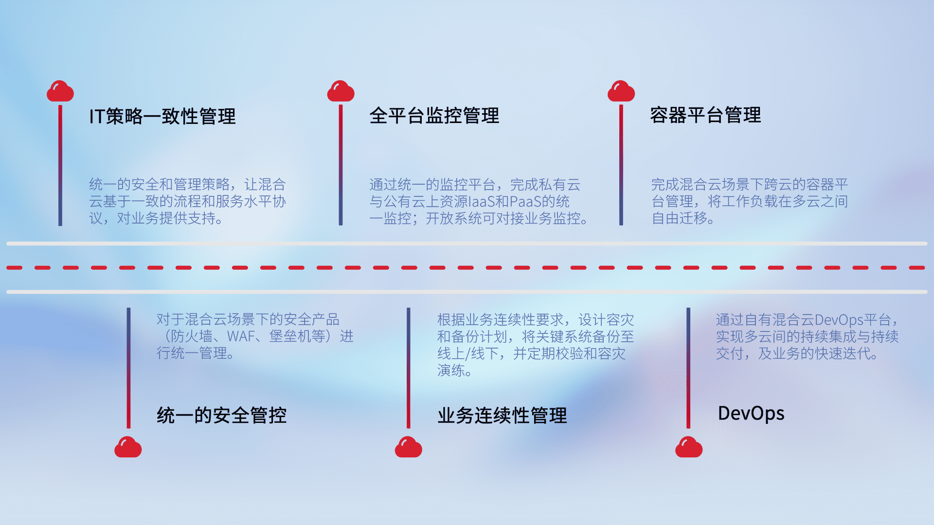 通过多云纳管,,,,以统一的资源数据模型把客户的云资源进行抽象和封装,,进而实现对多云资源的统一操作,,,,保障云资源管理的可靠性、、稳定性与可用性。。。量身定制化运维内容,,,配置、、、、开发运维、、、补丁管理、、、、备份、、监控、、认证和访问管理、、审计和日常巡检等,,,,保障在用云过程中的可靠度,,稳定度以及高可用率。。