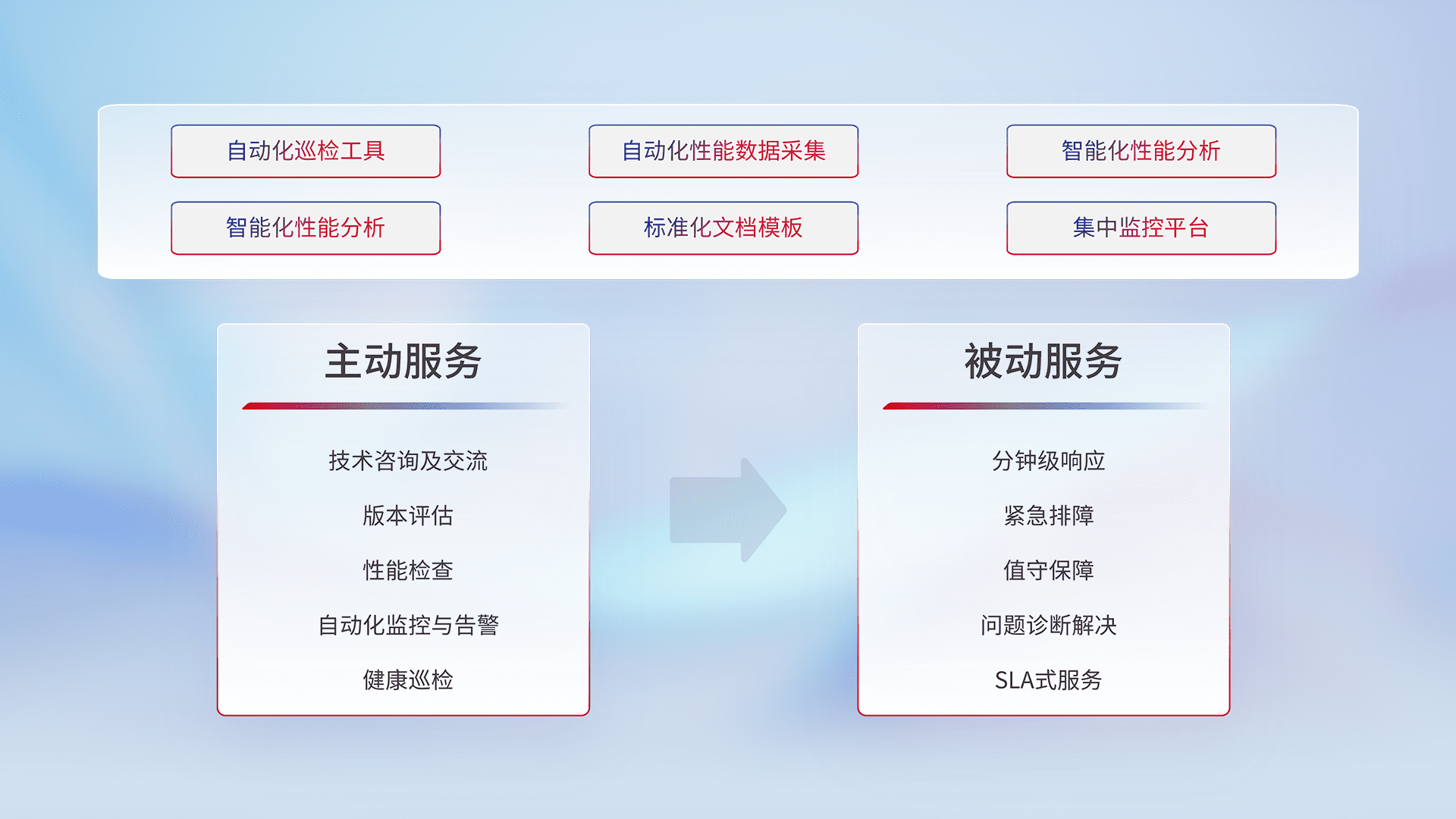 智能化工具和标准化文档,,,保障服务质量,,提供主动服务(包含技术咨询、、、版本评估、、、、性能检查、、、、自动化监控与告警、、、、健康巡检)和被动服务包含(分钟级响应、、、紧急排障、、值守保障、、、问题诊断解决、、SLA服务)。。。。